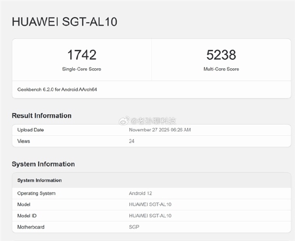 有博主分享了一组麒麟9030 Pro的Geekbench 6跑分。其中,单核1742分,多核5238分。